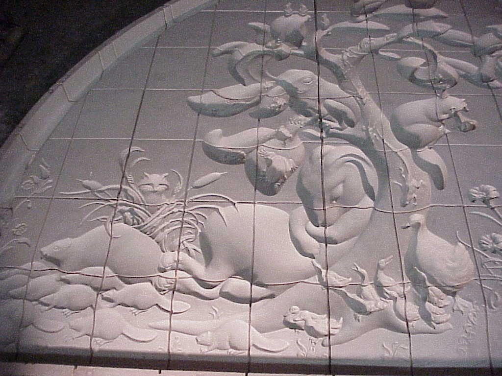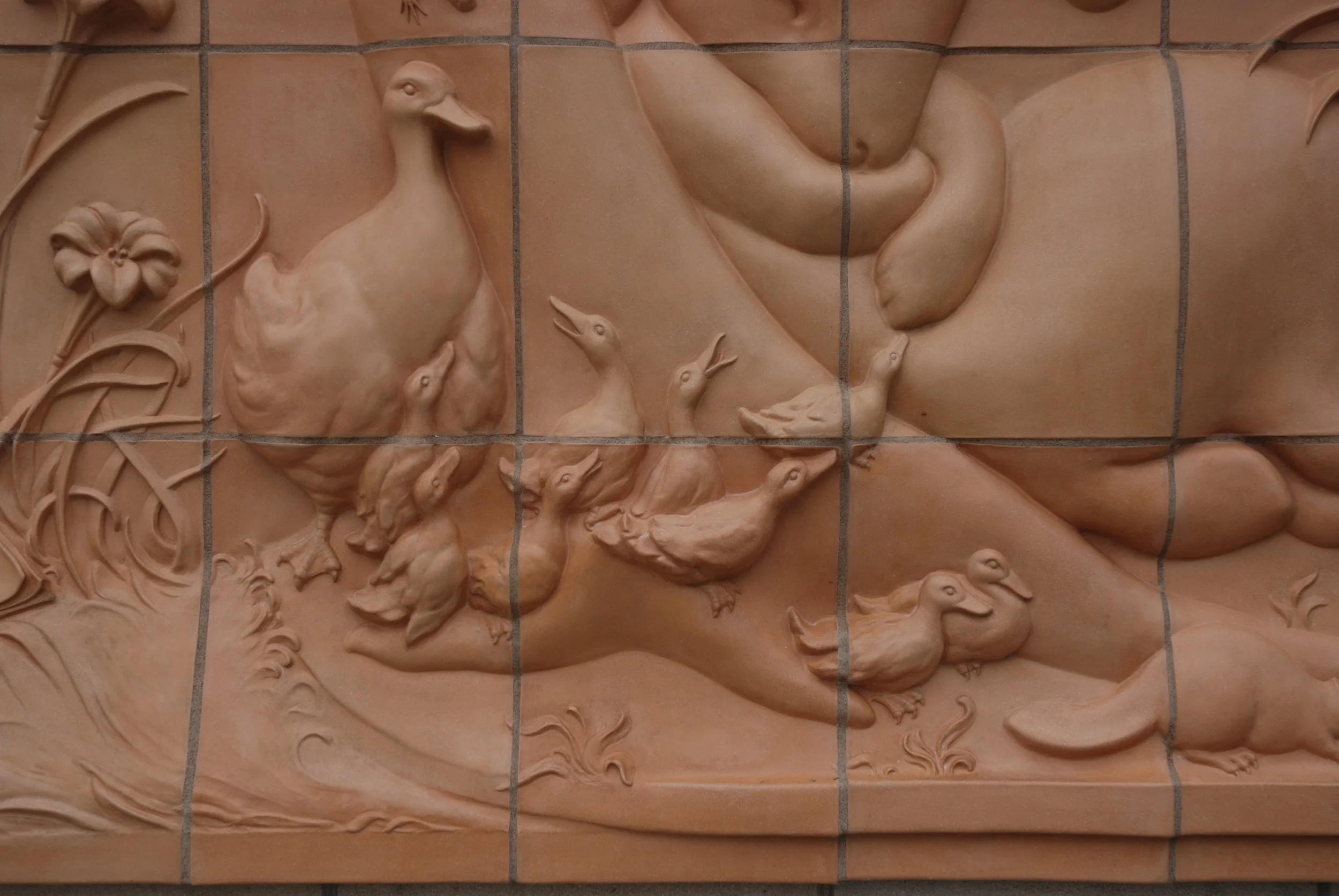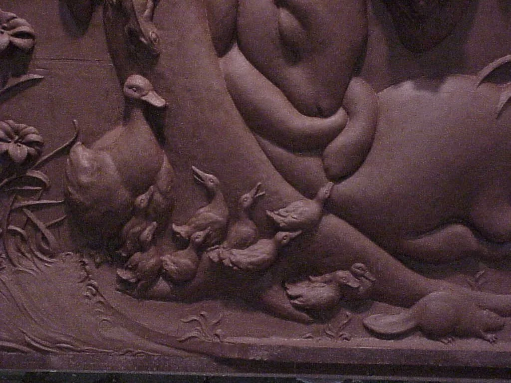 Large clay model, 1 duckling attempts to wake the bunny.