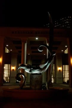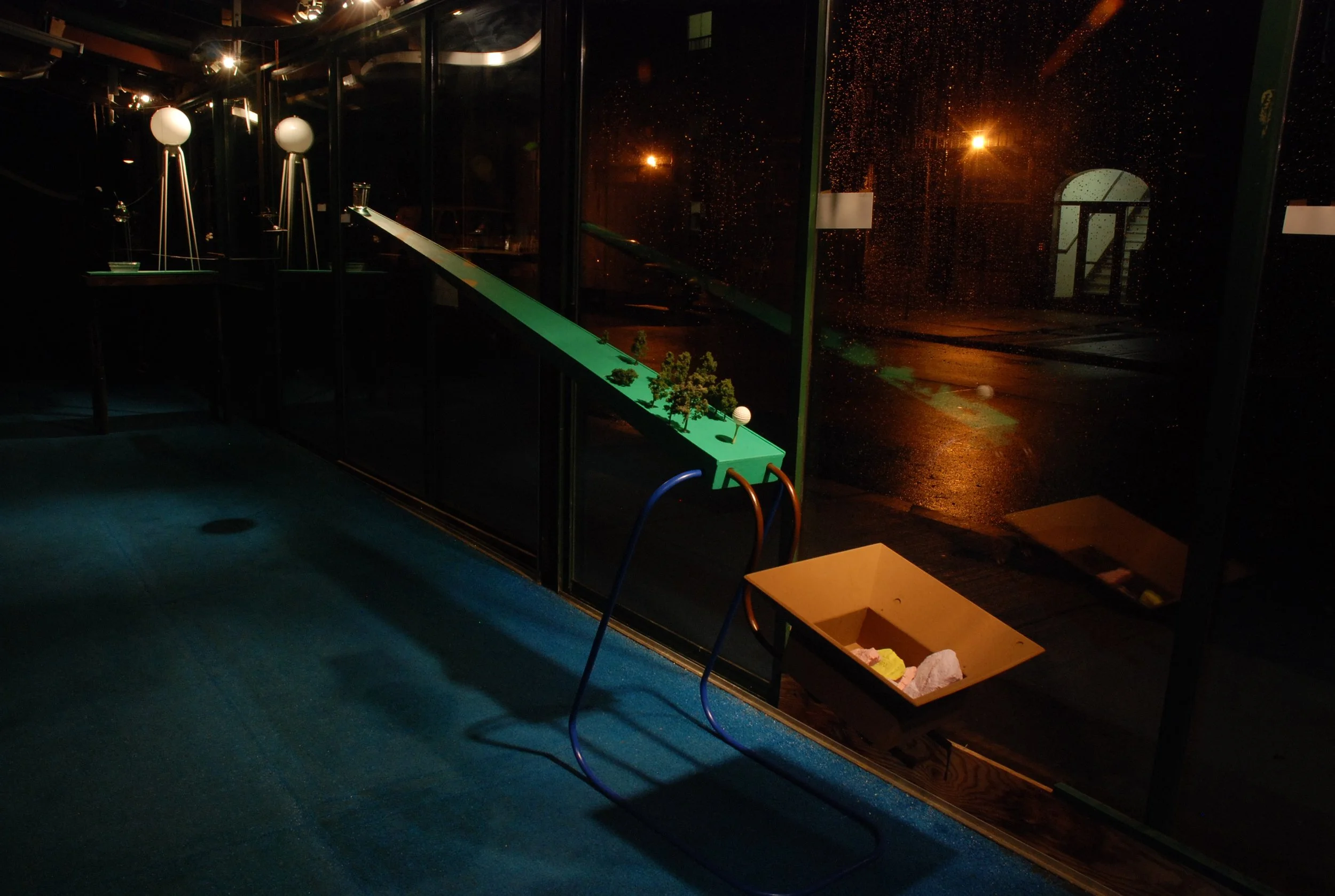 Figure suspended above rectangular water wall. Submerged lights in circular pool.