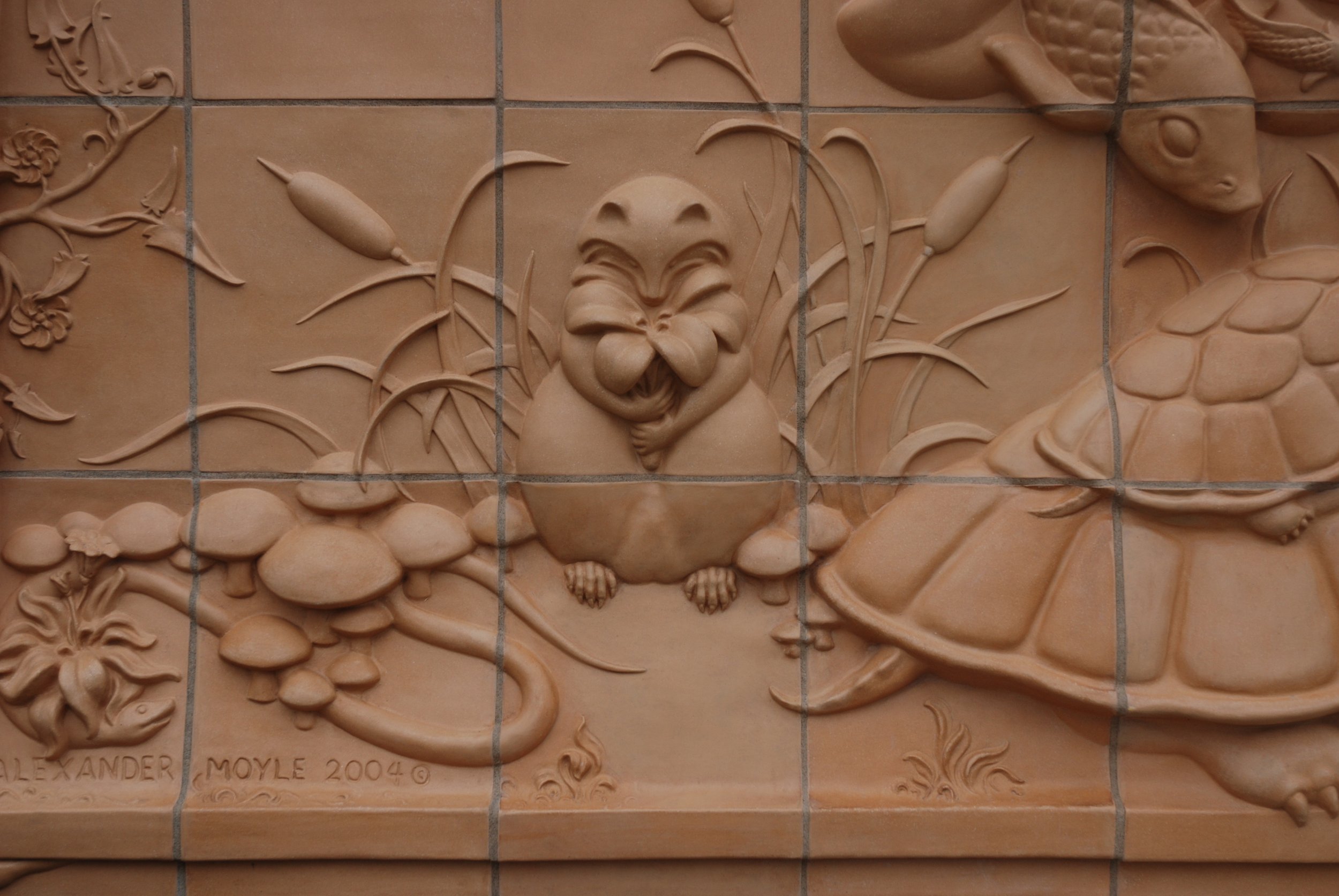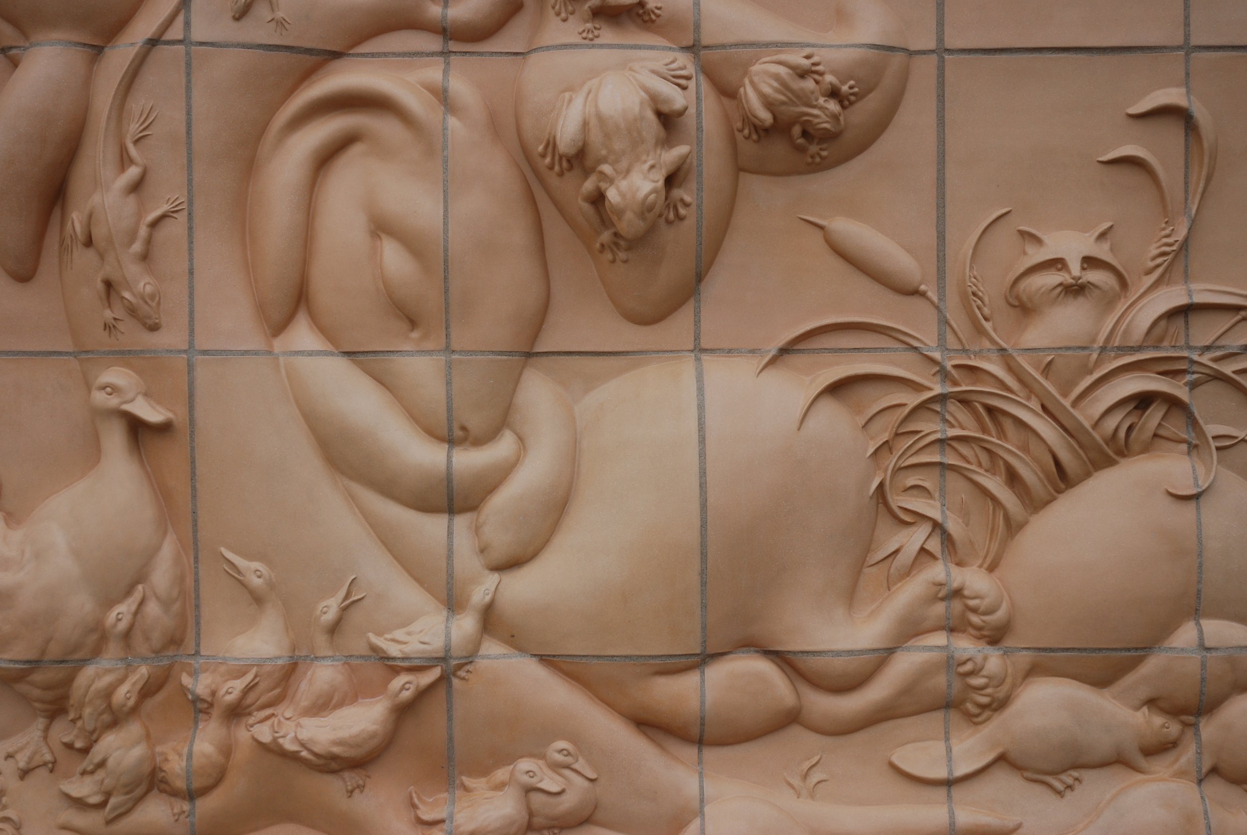 Raccoon, snake, turtles, fish, mushrooms and cattails
