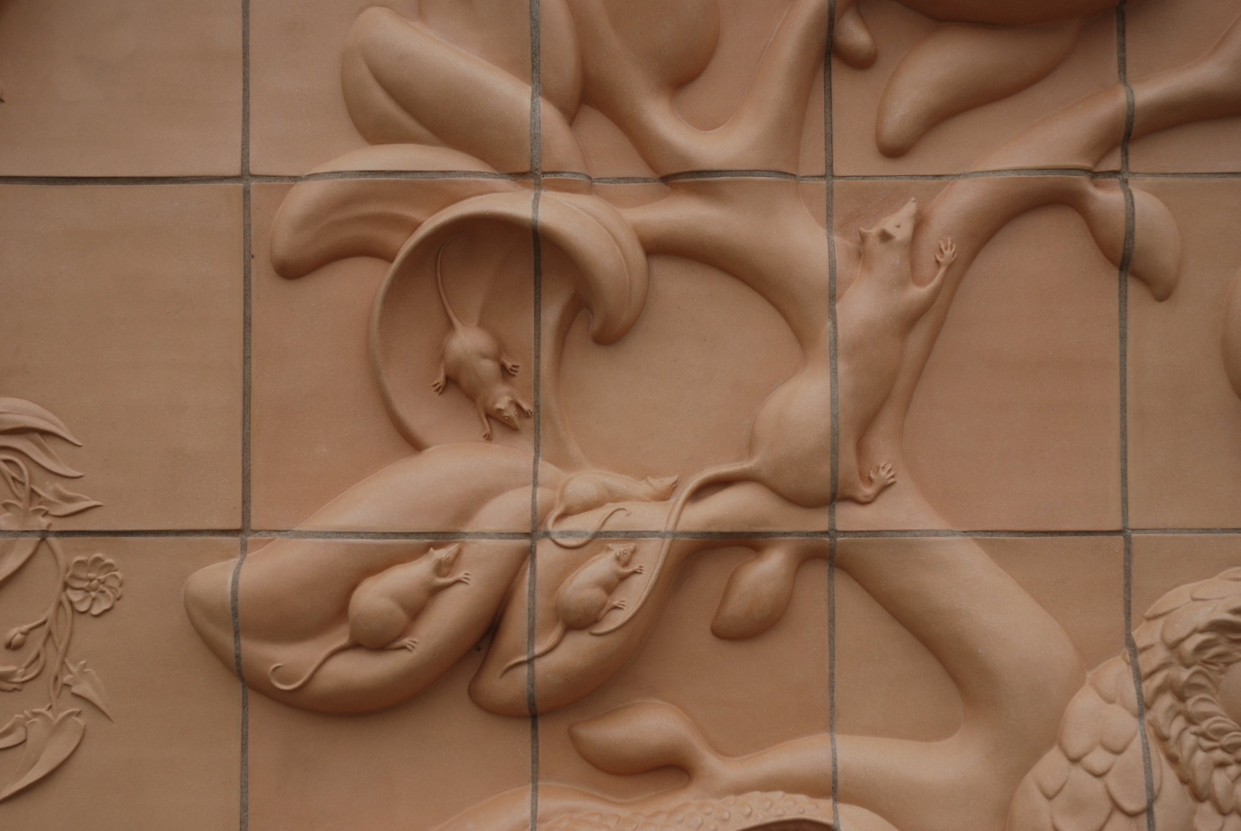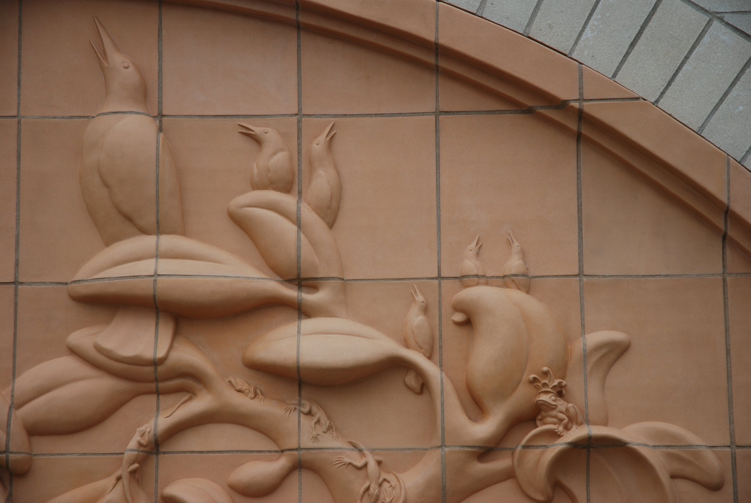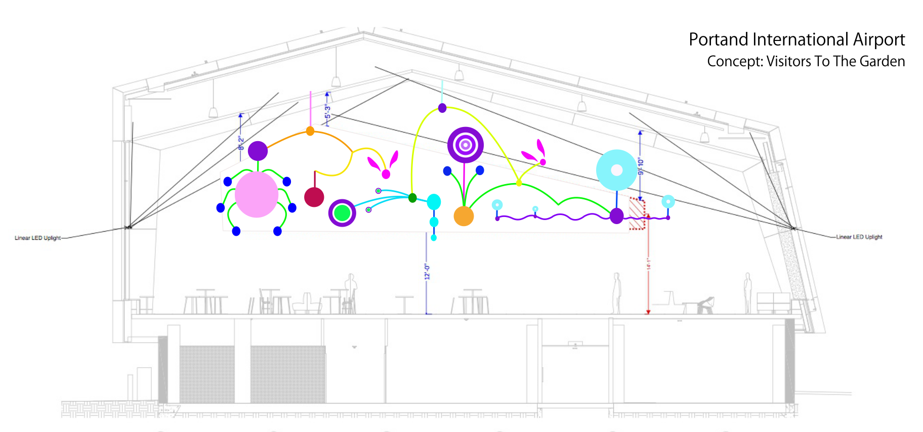 Visitors, is a mobile of a garden suspended in the atrium of an airport. Insects, birds, reptiles, mollusks and mammals visitor the garden as well as some travellers.