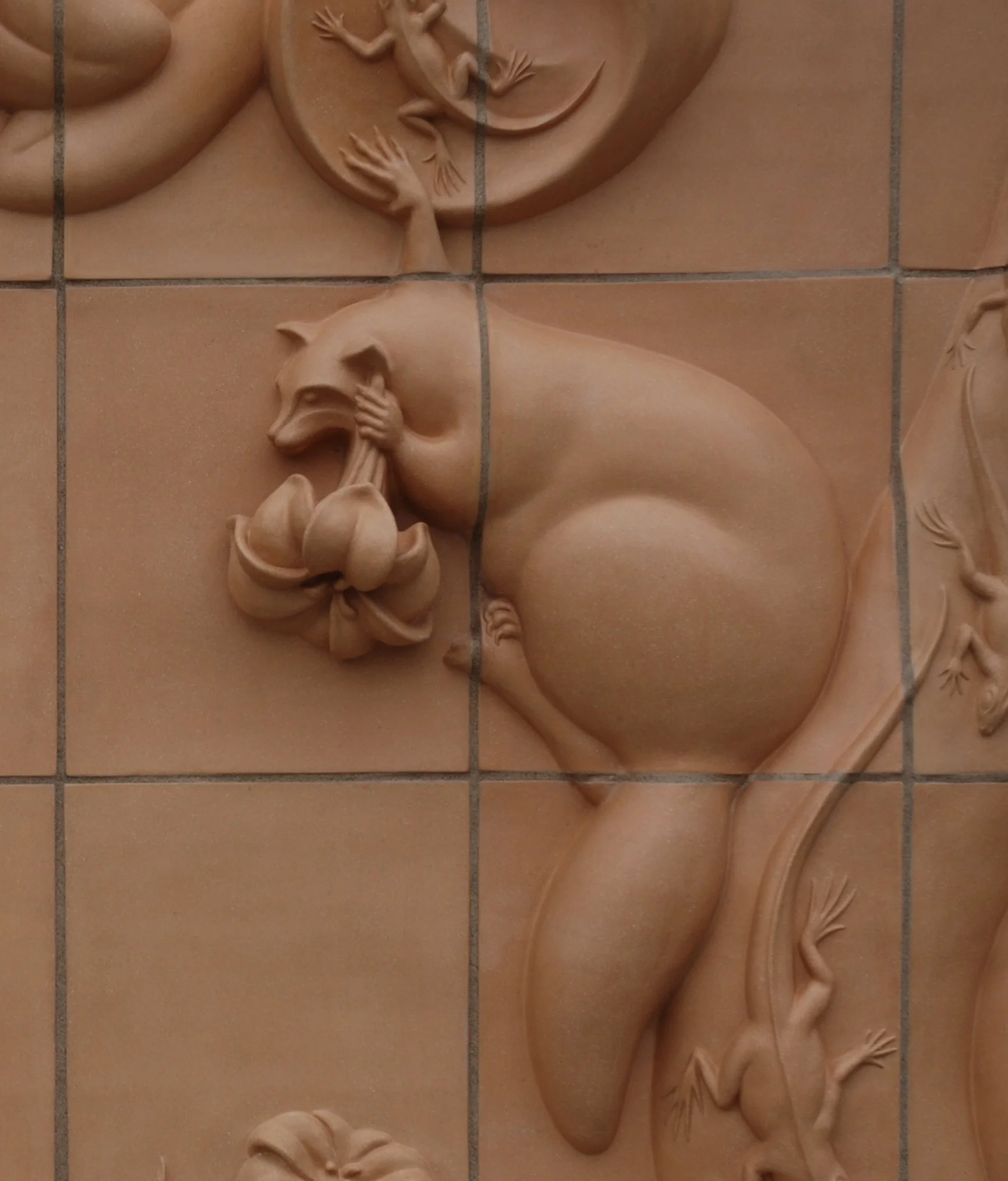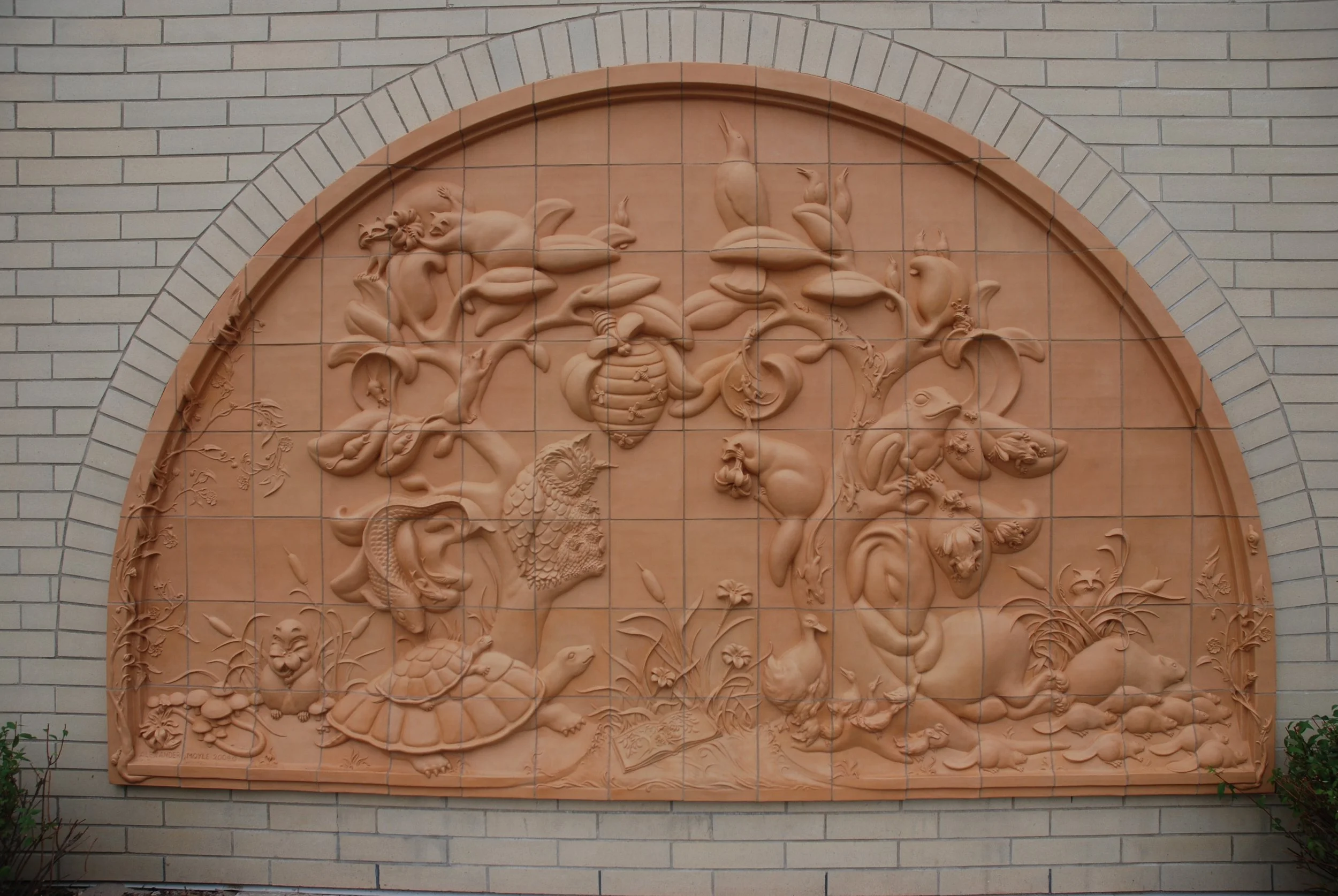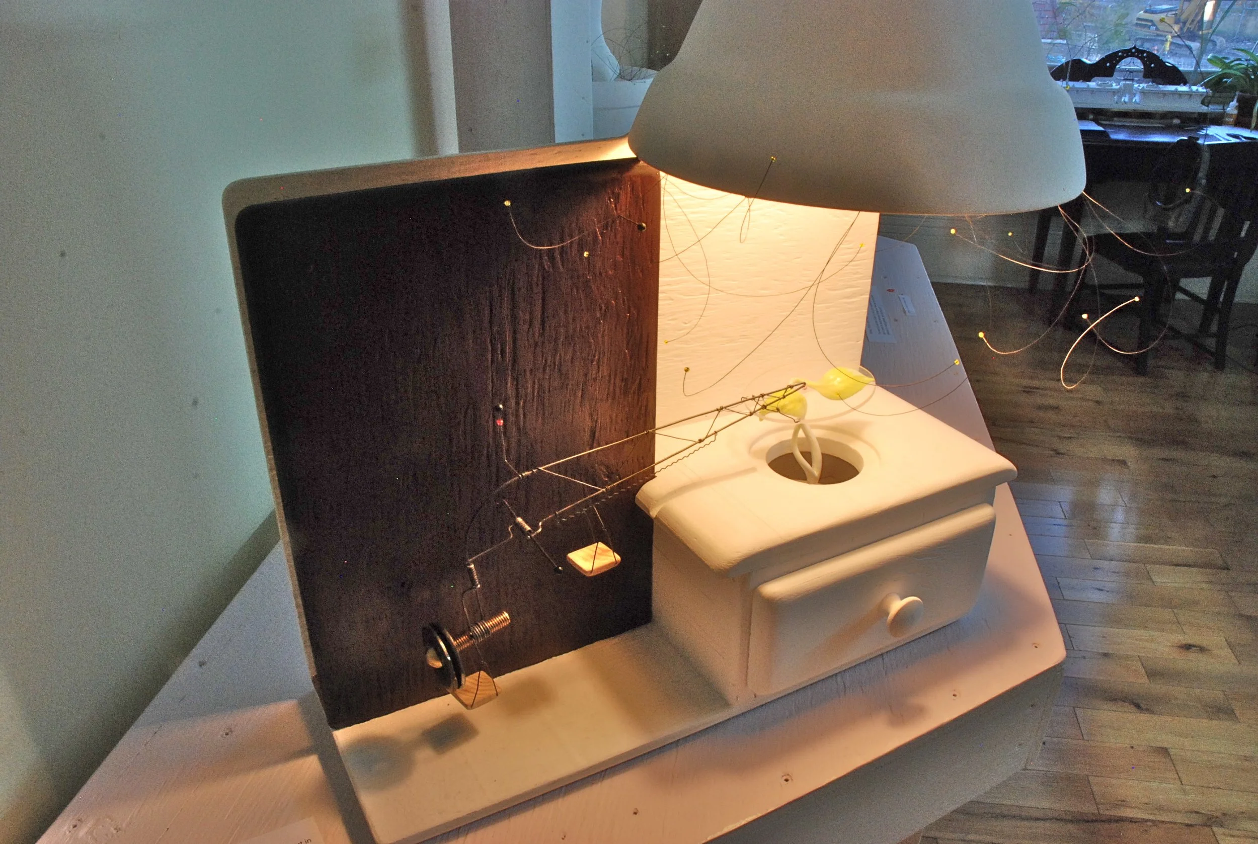 Visitors, is a mobile of a garden suspended in the atrium of an airport. Insects, birds, reptiles, mollusks and mammals visitor the garden as well as some travellers.