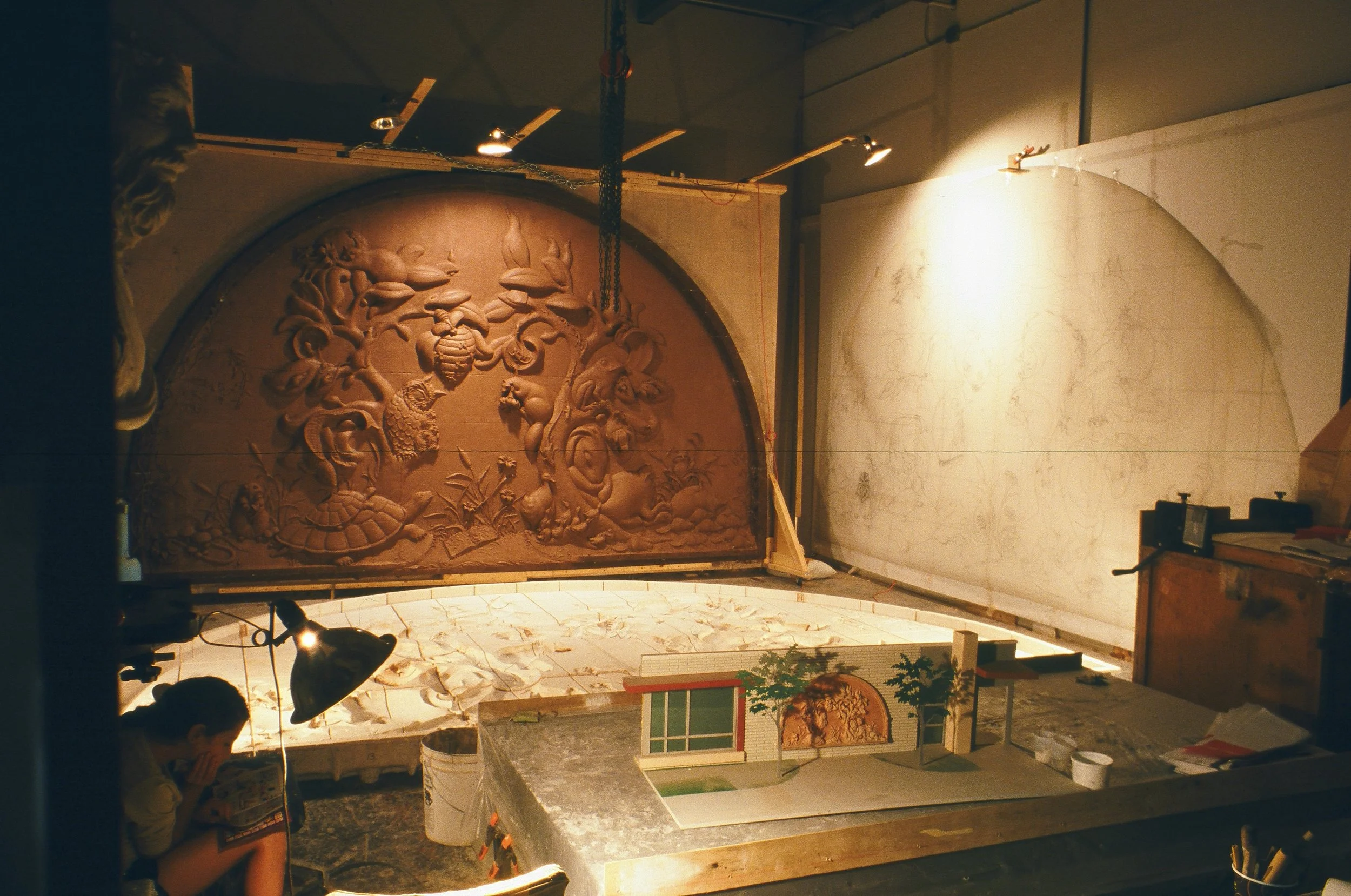 Clay model, large drawing, plaster mold and architectural model