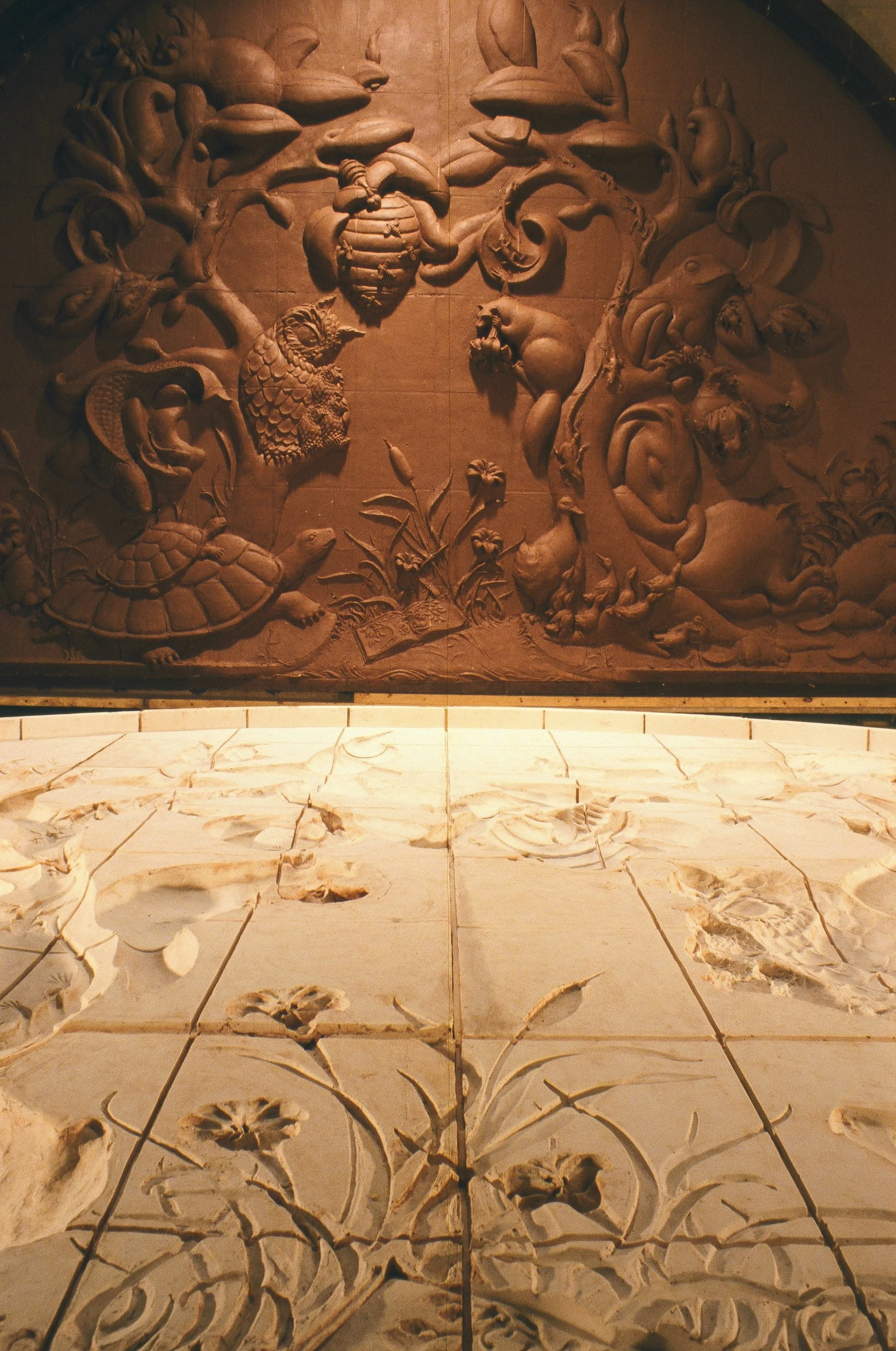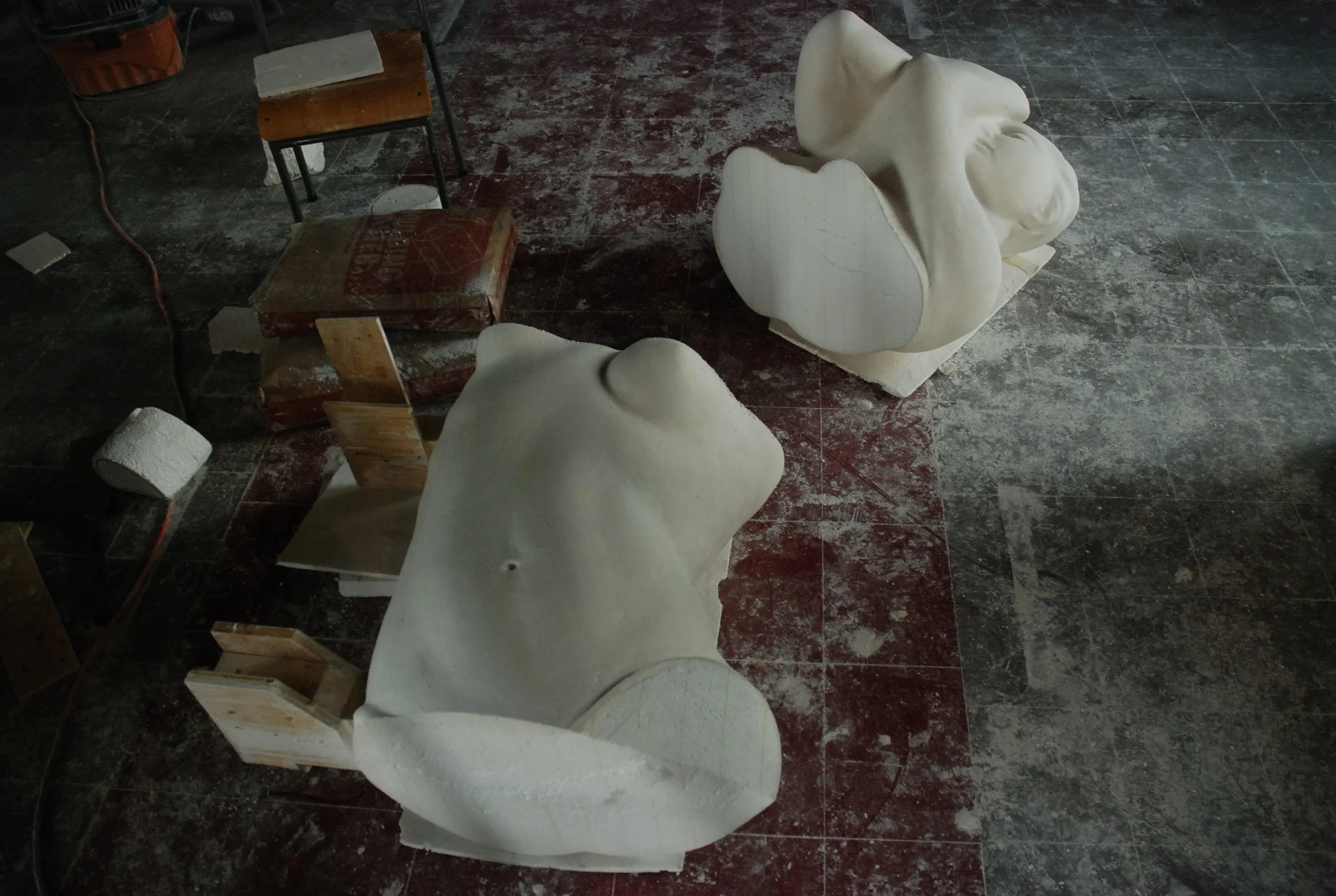 Enlarged models carved from foam. The foam's surface is finished with plaster.
