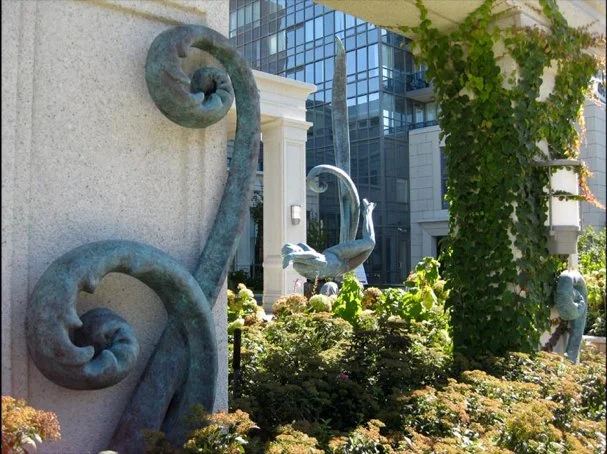 Unfurling bronze fiddleheads mounted to architectural columns in the landscape.