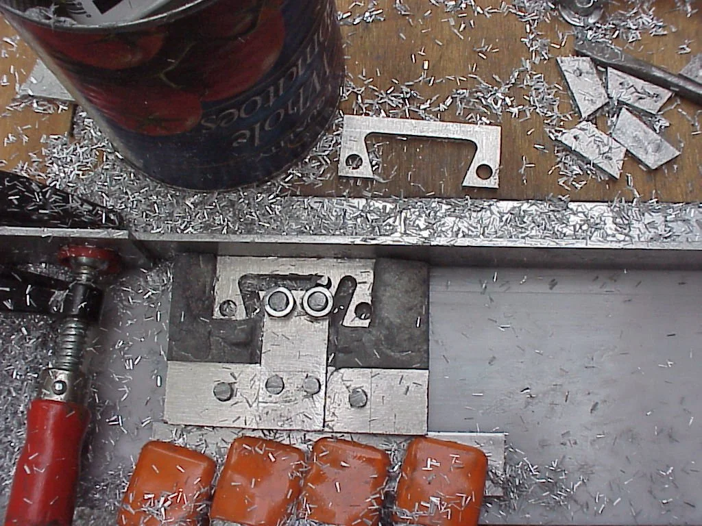 Milling aluminum tie back clips. A pair of clips are attached to the back of each tile.